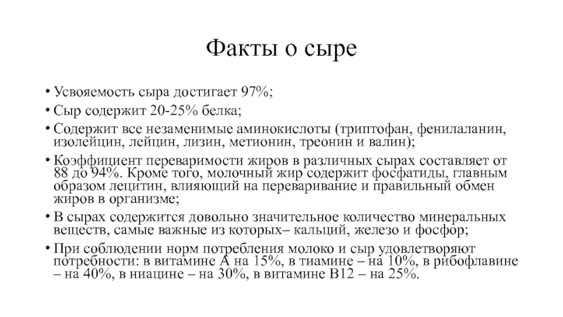 Коэффициент переваримости жиров в различных сырах составляет от 88 до 94%. Кроме того, молочный жир содержит фосфатиды, главным образом лецитин, влияющий на переваривание и правильный обмен жиров в организме;