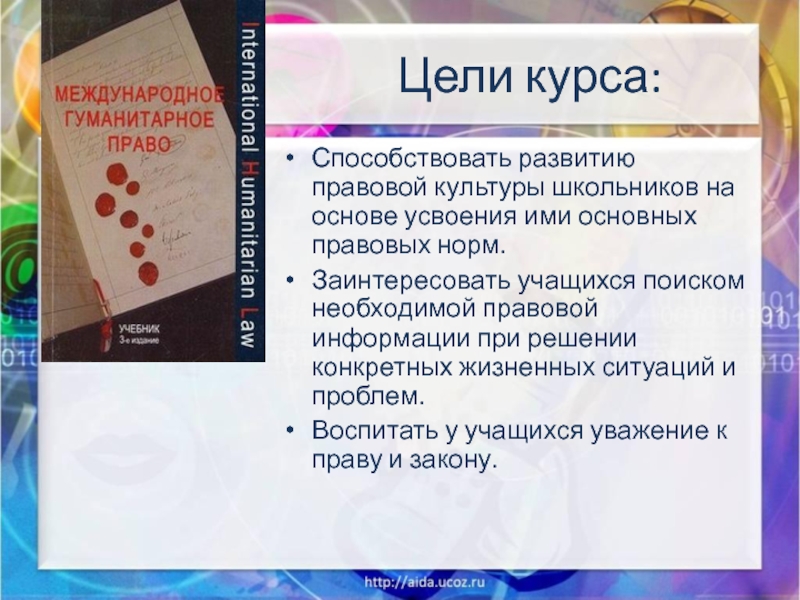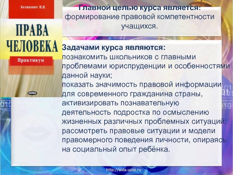 показать значимость правовой информации для современного гражданина страны, активизировать познавательную деятельность подростка по осмыслению жизненных различных проблемных ситуаций;