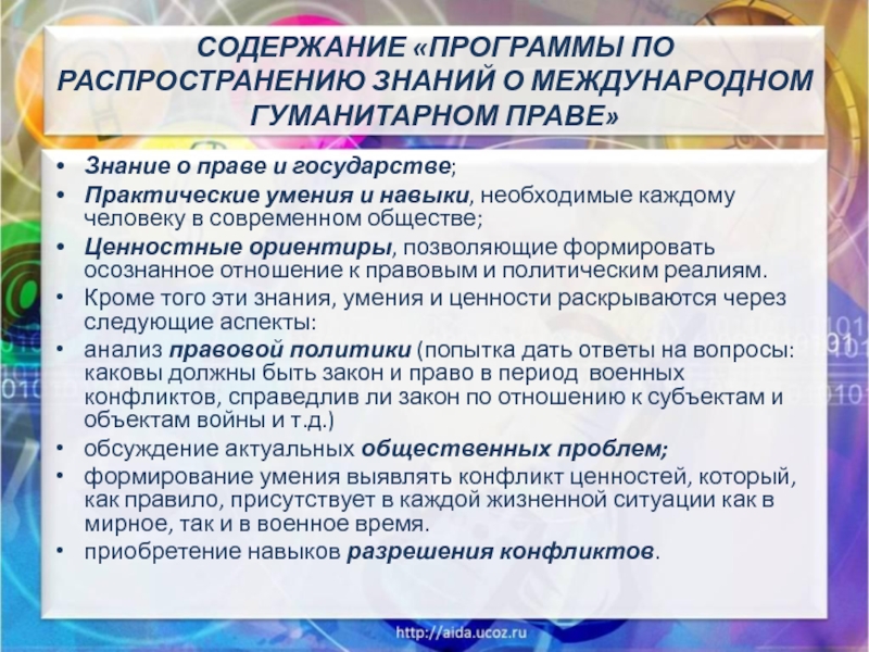 Слайд 4СОДЕРЖАНИЕ «ПРОГРАММЫ ПО РАСПРОСТРАНЕНИЮ ЗНАНИЙ О МЕЖДУНАРОДНОМ ГУМАНИТАРНОМ ПРАВЕ»