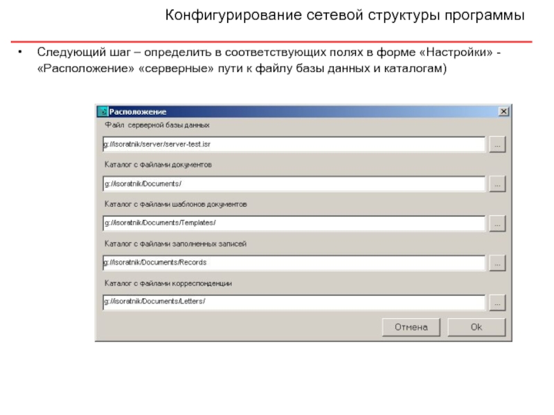 После входа в программу в демо-режиме Admin определяет (меню «Настройки» - «Расположение») путь к файлу серверной базы данных, записанному на ПК-сервер, а также пути к каталогам документов, шаблонов документов, заполненных записей и файлов корреспонденции, также определенным на ПК-сервере на стадии конфигурирования программы на ПК-сервере