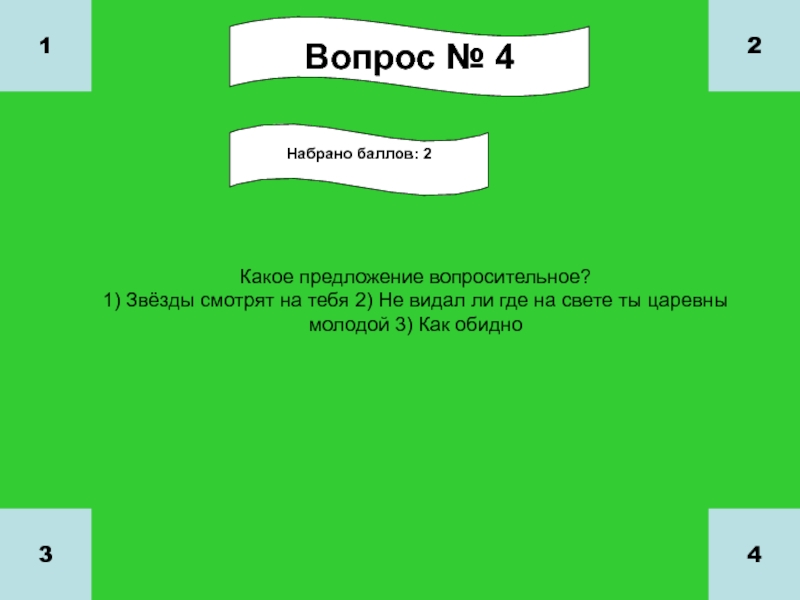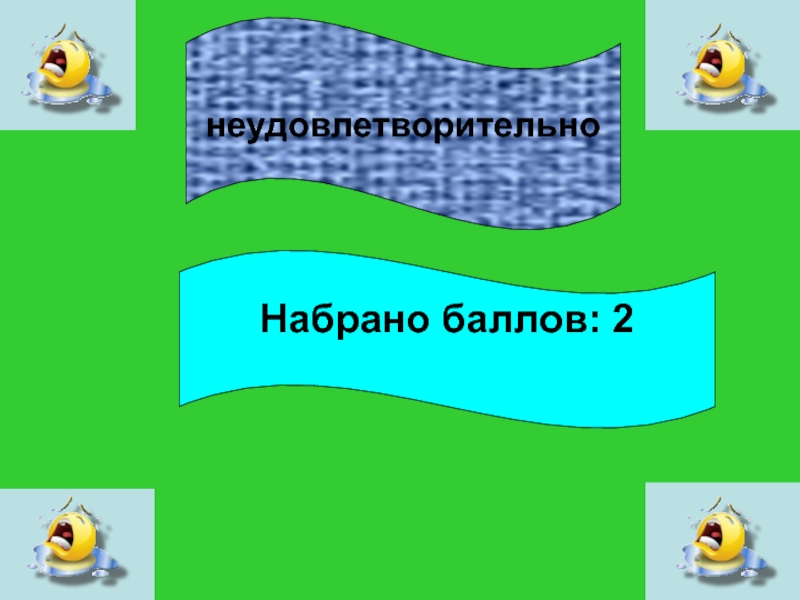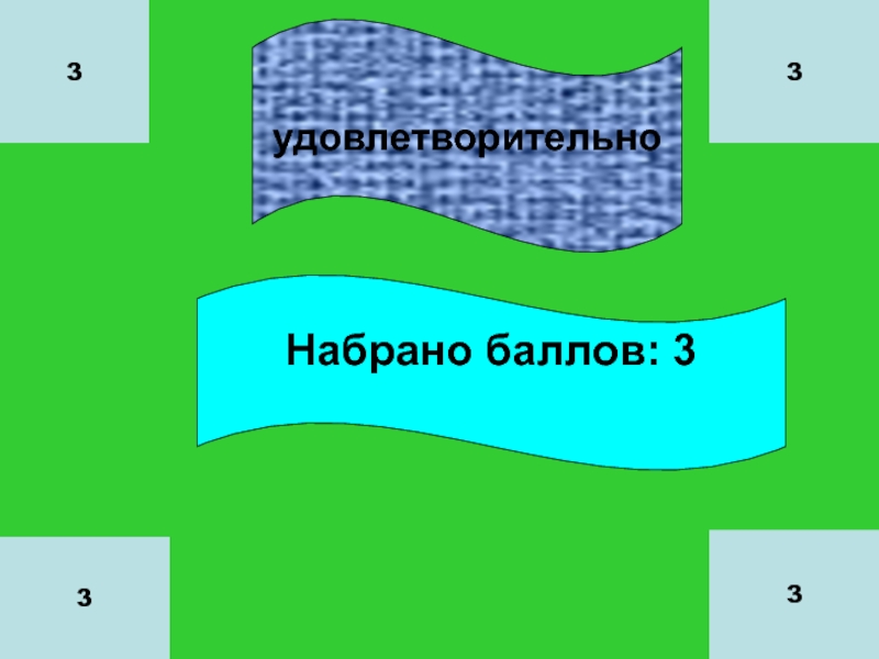 них имеет только один вариант правильного ответа. Используя кнопки в углах экрана, выберите тот вариант ответа, который, по Вашему мнению, является верным. Следующий экран будет зеленым, если ответ был точным, и красным, если Вы ошиблись. Текущее количество набранных баллов автоматически высвечивается под номером вопроса. За каждый правильный ответ начисляется один балл. Для получения отметки «отлично» нужно заработать пять баллов, «хорошо» - 4 балла, «удовлетворительно» - 3 балла. Итоговый результат и общее число набранных баллов вы узнаете, ответив на последний вопрос