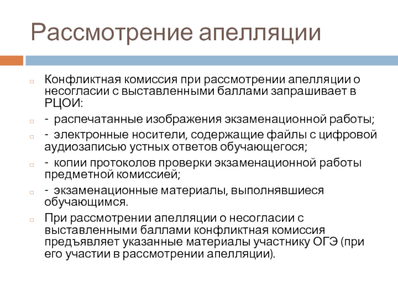 При рассмотрении апелляции о несогласии с выставленными баллами конфликтная комиссия предъявляет указанные материалы участнику ОГЭ (при его участии в рассмотрении апелляции).