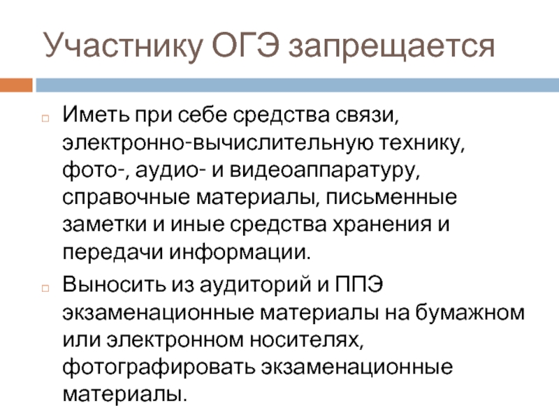 Выносить из аудиторий и ППЭ экзаменационные материалы на бумажном или электронном носителях, фотографировать экзаменационные материалы.