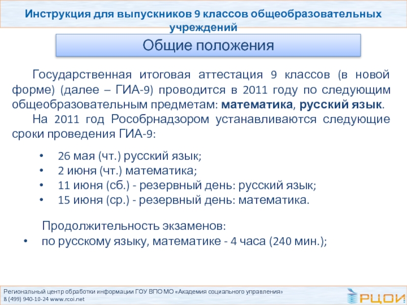 Государственная итоговая аттестация 9 классов (в новой форме) (далее – ГИА-9) проводится в 2011 году по следующим общеобразовательным предметам: математика, русский язык.