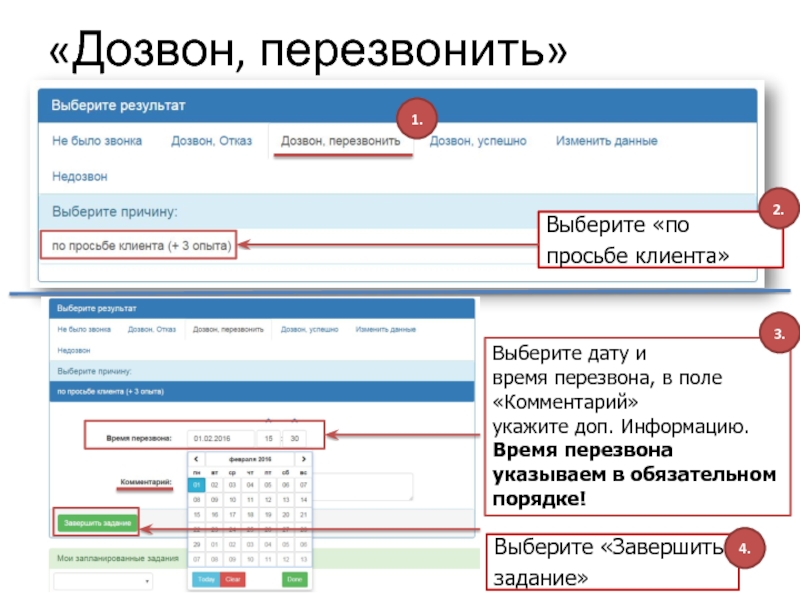 Если есть необходимость не закреплять задание за собой, тогда выбираем «Не было звонка»- «другое», в «комментарии» причину не закрепления, и Фамилию сотрудника, которому передали задание. Дату и время перезвона не выбираем, иначе задание закрепится.