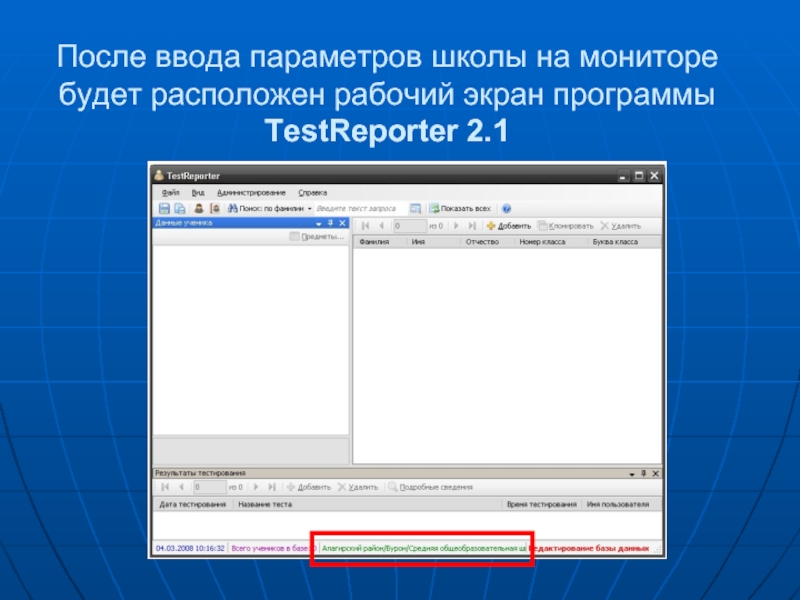 Слайд 6После ввода параметров школы на мониторе будет расположен рабочий экран программы