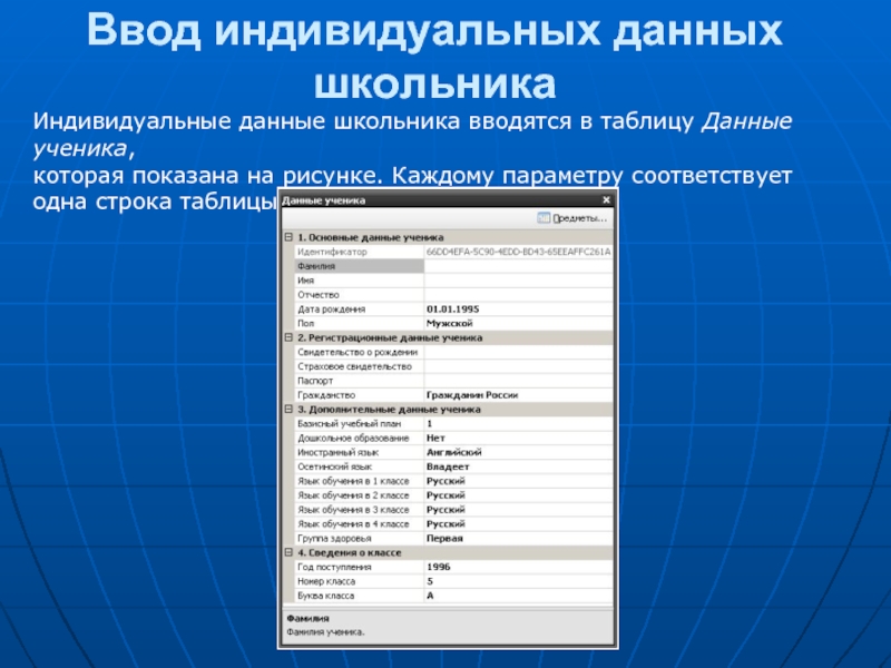 Индивидуальные данные школьника вводятся в таблицу Данные