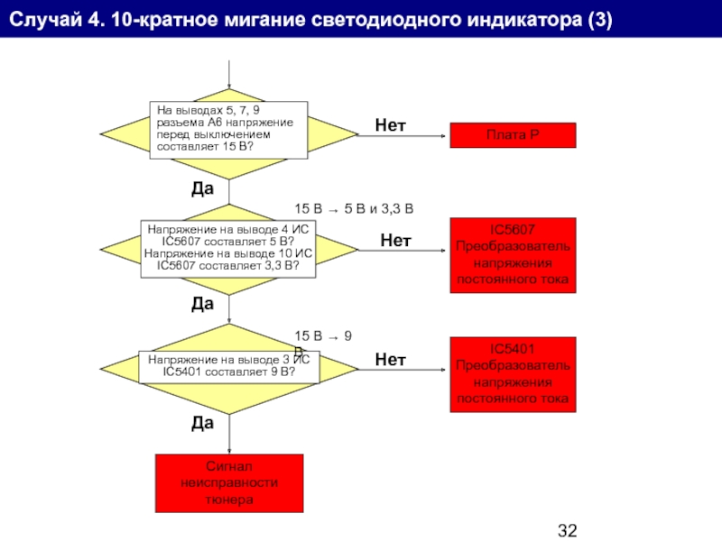 Поэтому при 10-кратном мигании светодиодного индикатора следует проверить выходное напряжение на выводах 4 и 10 ИС IC5607 и на выводе 3 ИС IC5401.