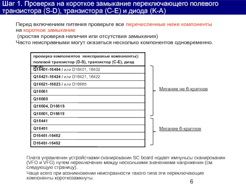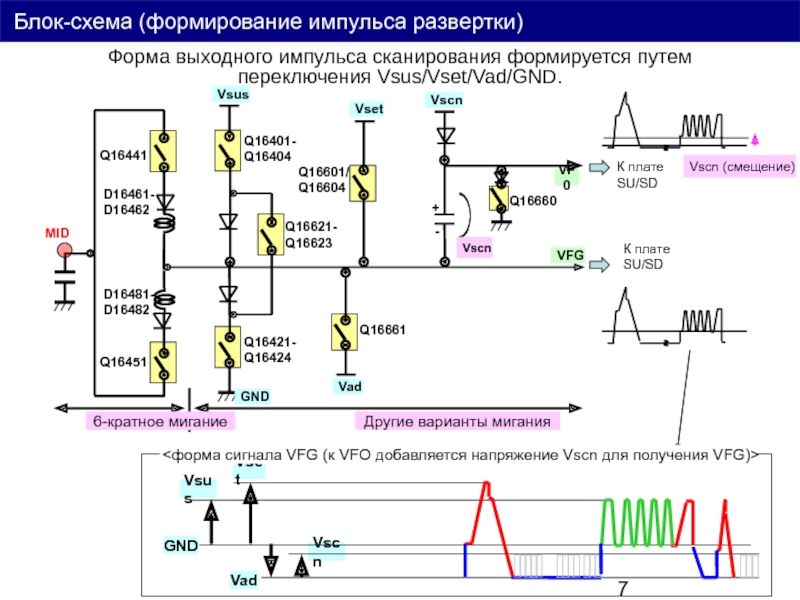 Плата управления устройствами сканирования SC board подает импульсы сканирования (VFO и VFG) путем переключения между несколькими значениями напряжения (см. следующую страницу).