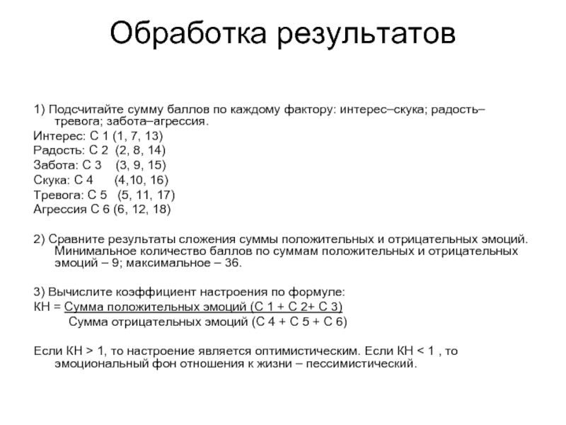 1) Подсчитайте сумму баллов по каждому фактору: интерес–скука; радость–тревога; забота–агрессия.
