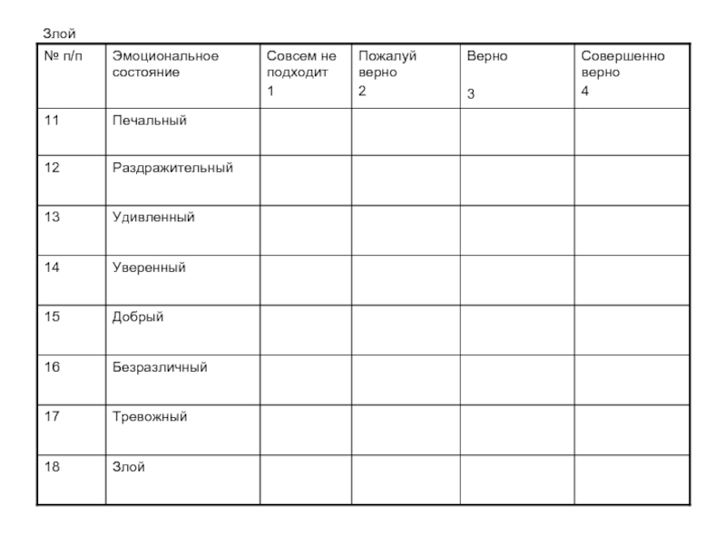 степени каждое слово выражает ваше настроение в данный момент: 1 – совсем не подходит; 2 – пожалуй, верно; 3- верно; 4 – совершенно верно