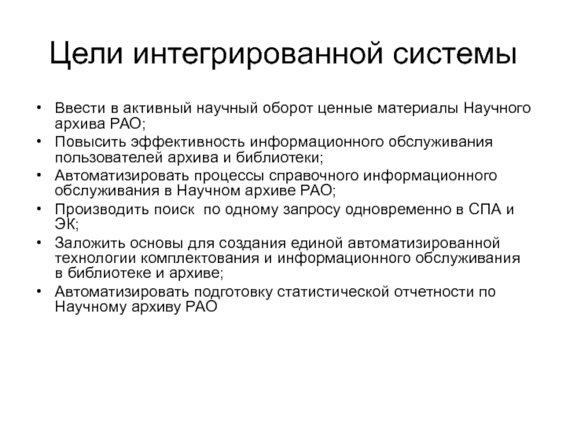 Автоматизировать процессы справочного информационного обслуживания в Научном архиве РАО;