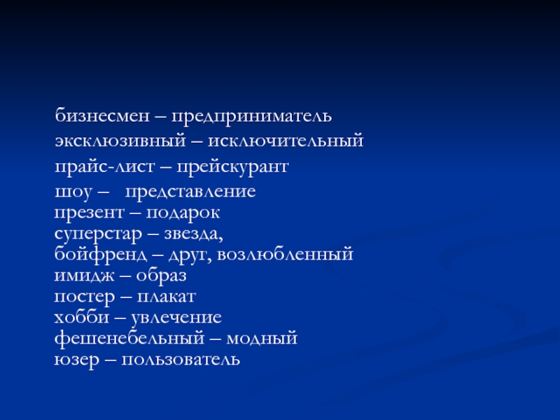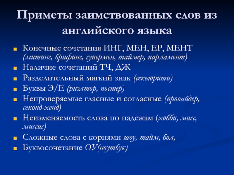 (Например, в XIX веке в русский язык пришли слова джентльмен, полисмен, а в начале 20 века к ним прибавились спортсмен, рекордсмен, яхтсмен, а в конце 20 века – бизнесмен, конгрессмен, кроссмен)