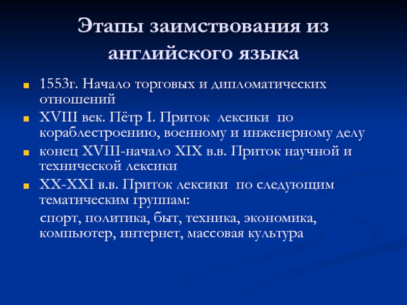 XX-XXI в.в. Приток лексики по следующим тематическим группам:
