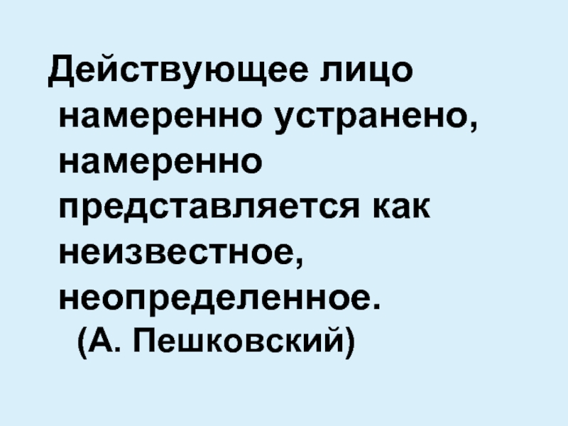 Слайд 11 Действующее лицо намеренно устранено, намеренно представляется как неизвестное, неопределенное. (А. Пешковский)