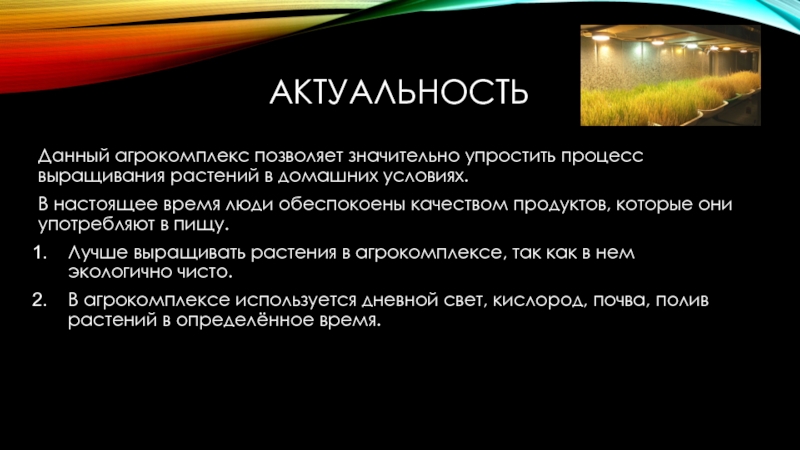 В агрокомплексе используется дневной свет, кислород, почва, полив растений в определённое время.