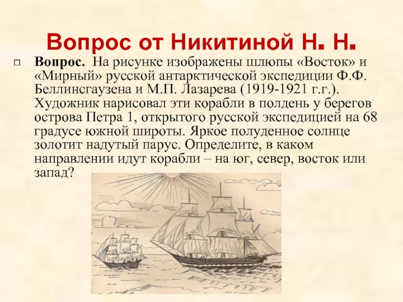 «Мирный» русской антарктической экспедиции Ф.Ф. Беллинсгаузена и М.П. Лазарева (1919-1921 г.г.). Художник нарисовал эти корабли в полдень у берегов острова Петра 1, открытого русской экспедицией на 68 градусе южной широты. Яркое полуденное солнце золотит надутый парус. Определите, в каком направлении идут корабли – на юг, север, восток или запад?