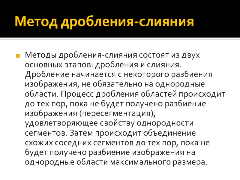 Дробление начинается с некоторого разбиения изображения, не обязательно на однородные области. Процесс дробления областей происходит до тех пор, пока не будет получено разбиение изображения (пересегментация), удовлетворяющее свойству однородности сегментов. Затем происходит объединение схожих соседних сегментов до тех пор, пока не будет получено разбиение изображения на однородные области максимального размера.