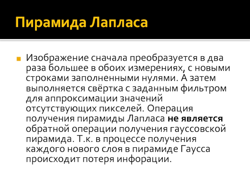 с новыми строками заполненными нулями. А затем выполняется свёртка с заданным фильтром для аппроксимации значений отсутствующих пикселей. Операция получения пирамиды Лапласа не является обратной операции получения гауссовской пирамида. Т.к. в процессе получения каждого нового слоя в пирамиде Гаусса происходит потеря инфорации.
