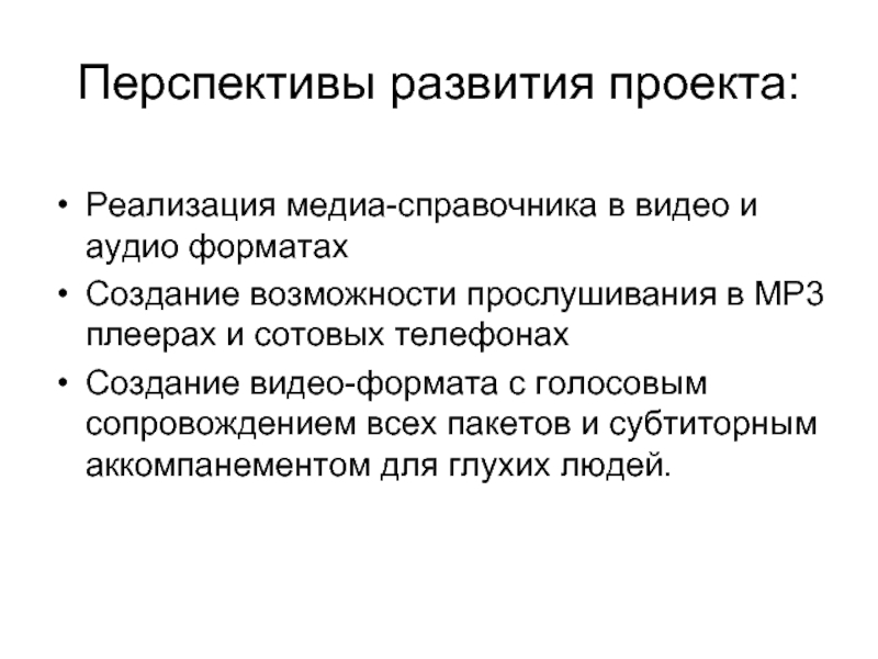 Создание видео-формата с голосовым сопровождением всех пакетов и субтиторным аккомпанементом для глухих людей.