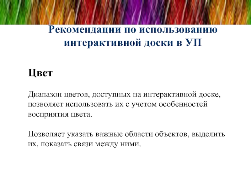 интерактивной доске, позволяет использовать их с учетом особенностей восприятия цвета.