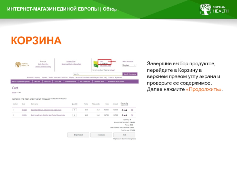 Завершив выбор продуктов, перейдите в Корзину в верхнем правом углу экрана