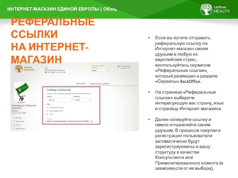 друзьям в любую из европейских стран, воспользуйтесь сервисом «Реферальные ссылки», который размещен в разделе «Сервисы» BackOffice.