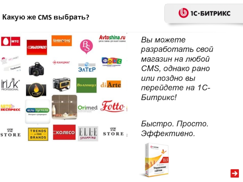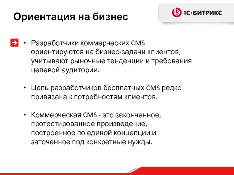 Слайд 8Разработчики коммерческих CMS ориентируются на бизнес-задачи клиентов, учитывают рыночные тенденции и