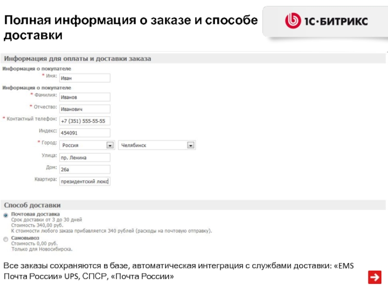 автоматическая интеграция с службами доставки: «EMS Почта России» UPS, СПСР, «Почта России»