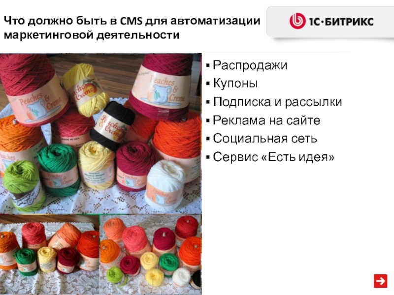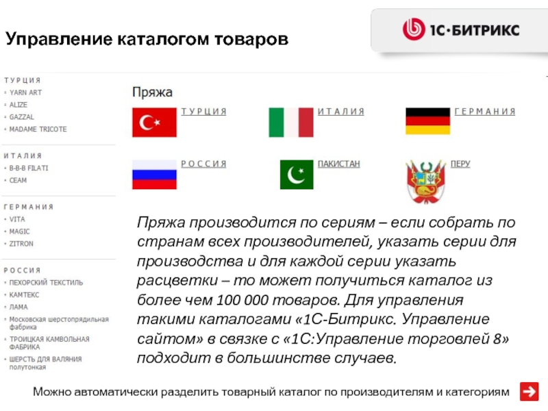 производится по сериям – если собрать по странам всех производителей, указать серии для производства и для каждой серии указать расцветки – то может получиться каталог из более чем 100 000 товаров. Для управления такими каталогами «1С-Битрикс. Управление сайтом» в связке с «1С:Управление торговлей 8» подходит в большинстве случаев.