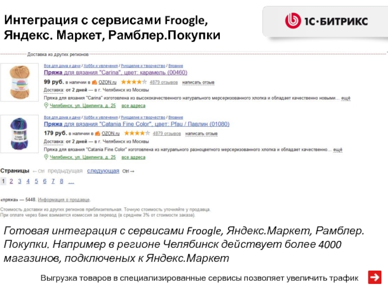 Готовая интеграция с сервисами Froogle, Яндекс.Маркет, Рамблер.Покупки. Например в регионе Челябинск действует более 4000 магазинов, подключеных к Яндекс.Маркет