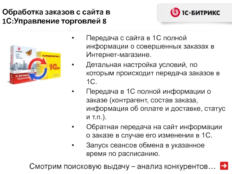 Передача в 1С полной информации о заказе (контрагент, состав заказа, информация об оплате и доставке, статус и т.п.).