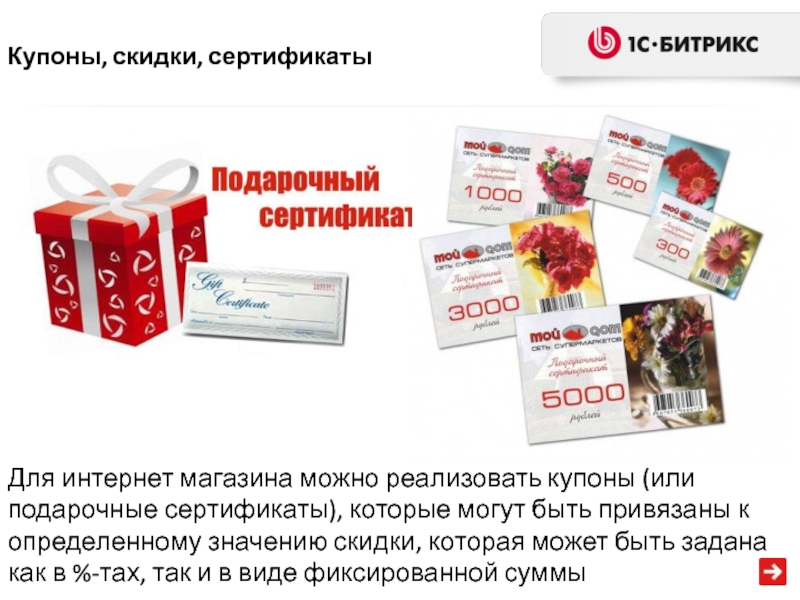 которые могут быть привязаны к определенному значению скидки, которая может быть задана как в %-тах, так и в виде фиксированной суммы