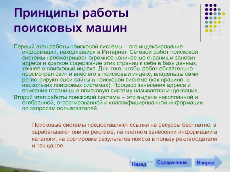 Поисковые системы предоставляют ссылки на ресурсы бесплатно, а зарабатывают они на рекламе, на платном занесении информации в каталоги, на сортировке результатов поиска в пользу рекламодателя и так далее.