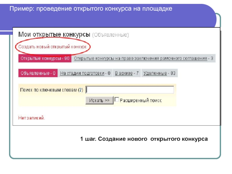 Слайд 701 шаг. Создание нового открытого конкурса