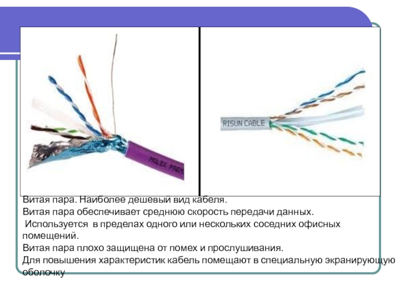 Слайд 8Витая пара. Наиболее дешевый вид кабеля.