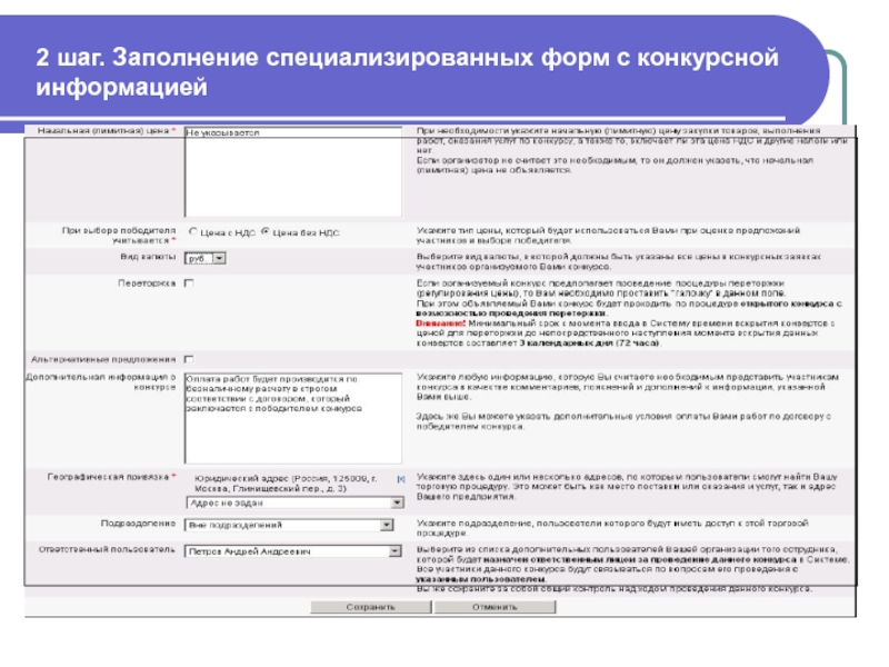 Слайд 712 шаг. Заполнение специализированных форм с конкурсной информацией