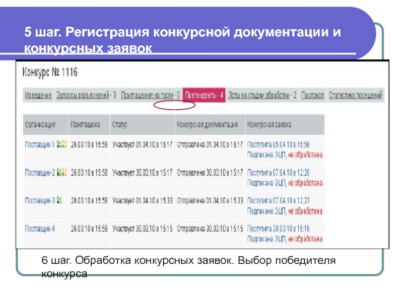 Слайд 745 шаг. Регистрация конкурсной документации и конкурсных заявок