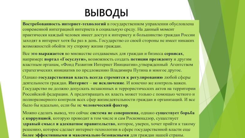 Все это выражается во множестве создаваемых для граждан и бизнеса сервисах, например: портал «Госуслуги», возможность создать петиции президенту и другим властным органам, «Фонд Развития Интернет Инициатив»,утвержденный Агентством стратегических инициатив по предложению Владимира Путина и многое другое.