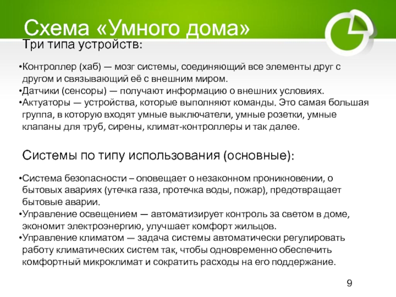 Система безопасности – оповещает о незаконном проникновении, о бытовых авариях (утечка газа, протечка воды, пожар), предотвращает бытовые аварии.