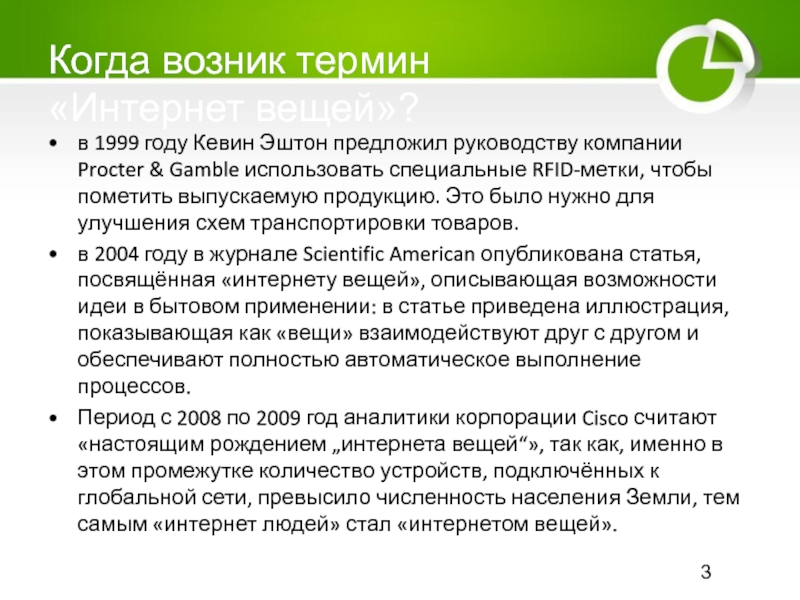Период с 2008 по 2009 год аналитики корпорации Cisco считают «настоящим рождением „интернета вещей“», так как, именно в этом промежутке количество устройств, подключённых к глобальной сети, превысило численность населения Земли, тем самым «интернет людей» стал «интернетом вещей».