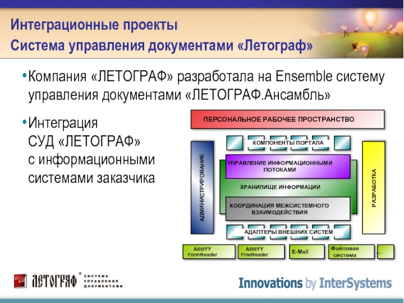 Для интеграции систем использовались адаптеры Ensemble к FTP, РСУБД и электронной почте