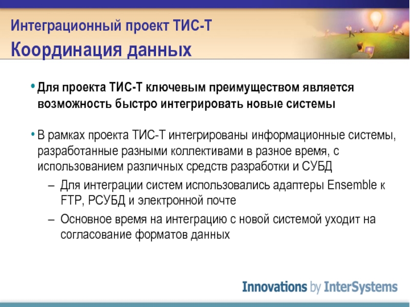 В рамках проекта ТИС-Т интегрированы информационные системы, разработанные разными коллективами в разное время, с использованием различных средств разработки и СУБД