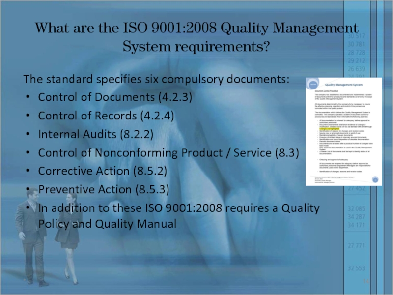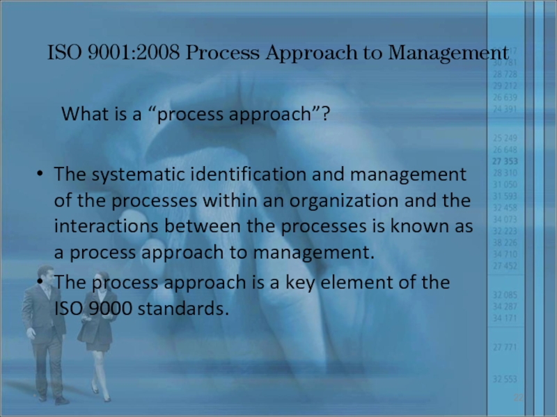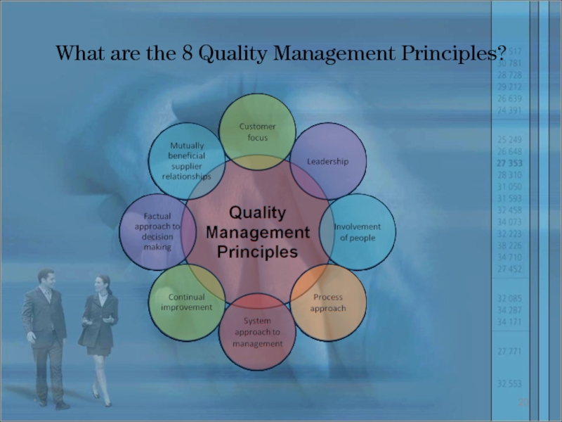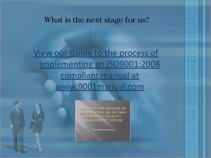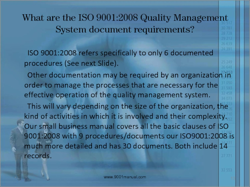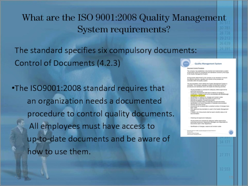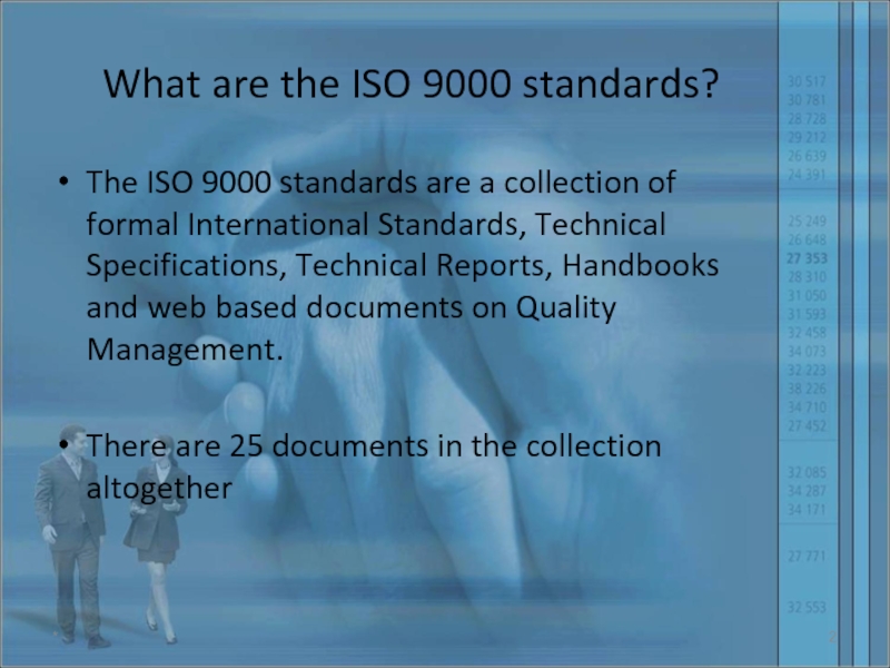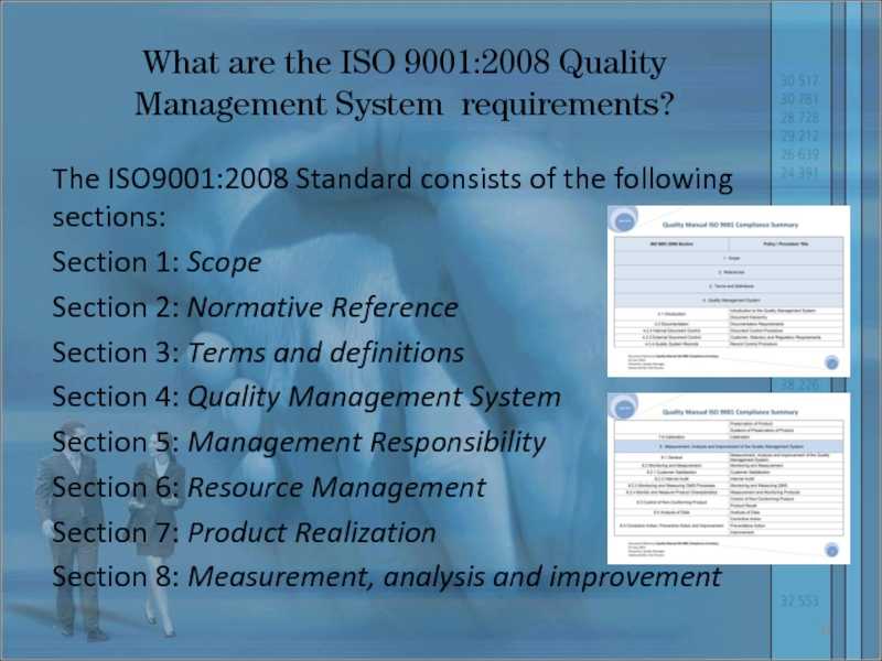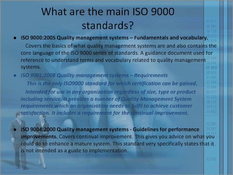 When initially starting to use ISO 9001, you should familiarize yourself with the Quality Management System standards, especially ISO 9000, ISO 9001 and ISO 9004, and consider their requirements.
