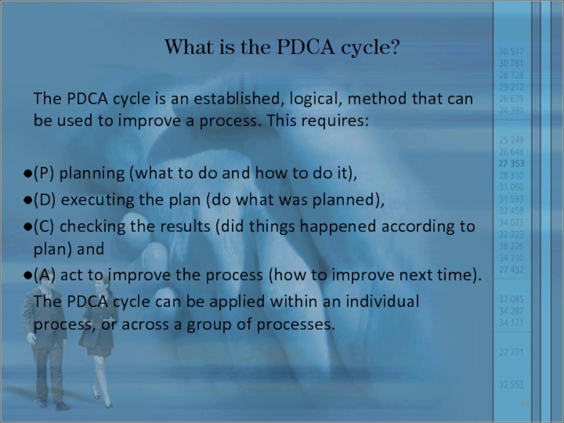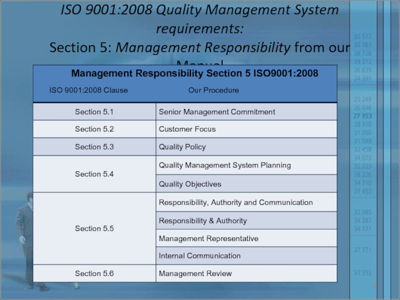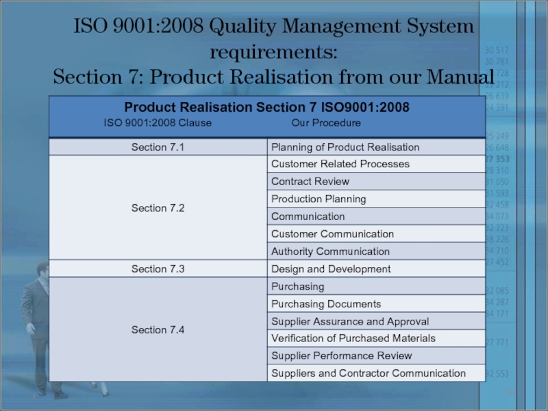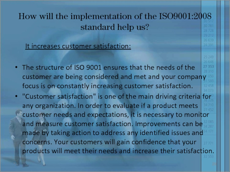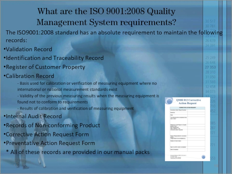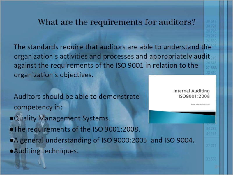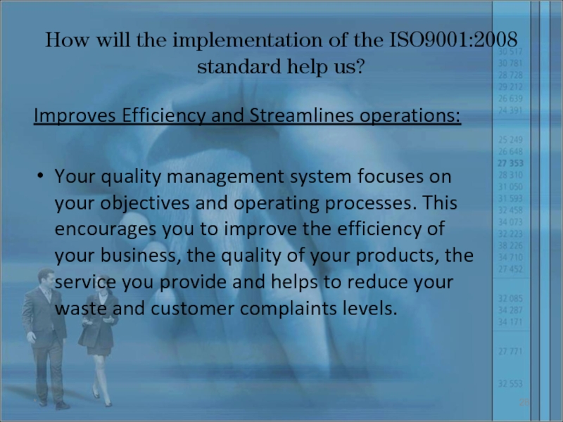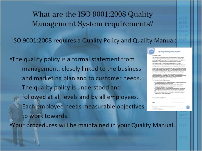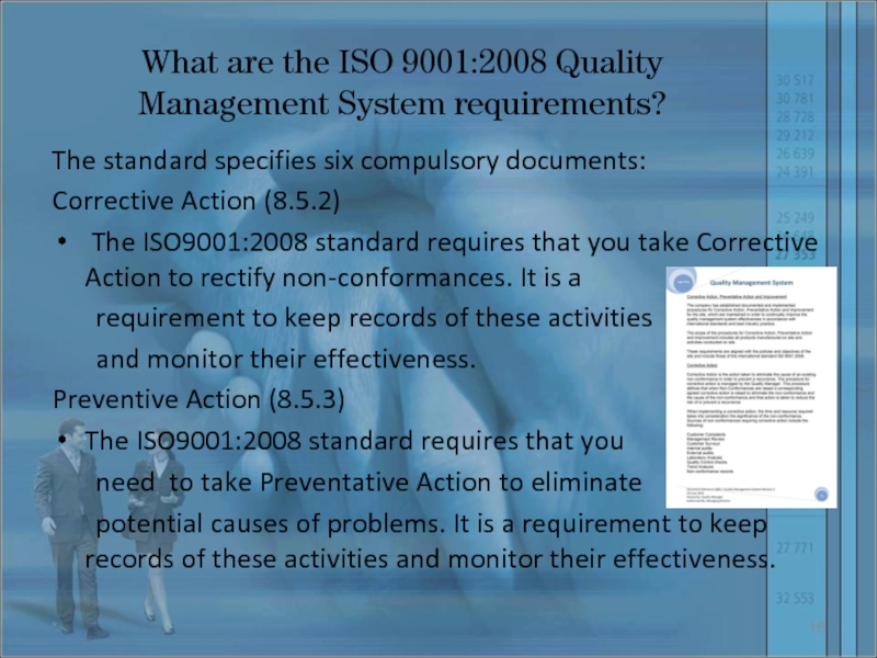 When initially starting to use ISO 9001, you should familiarize yourself with the Quality Management System standards, especially ISO 9000, ISO 9001 and ISO 9004, and consider their requirements.