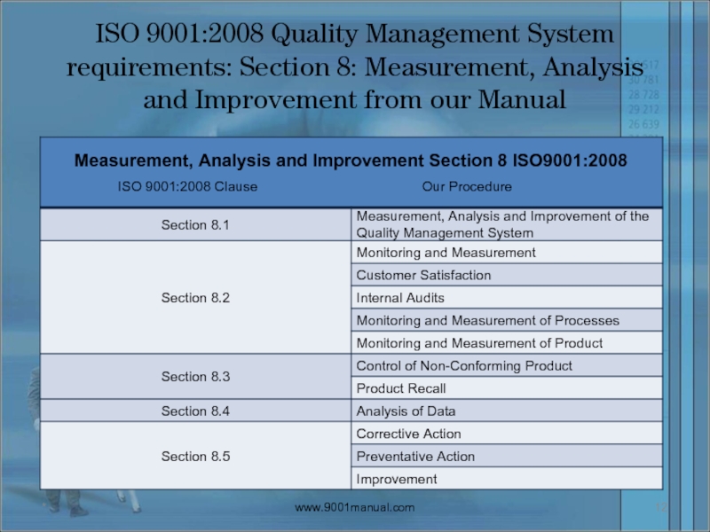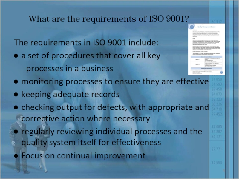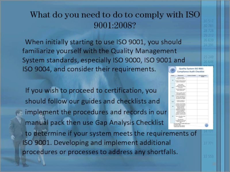 to determine if your system meets the requirements of ISO 9001. Developing and implement additional procedures or processes to address any shortfalls.