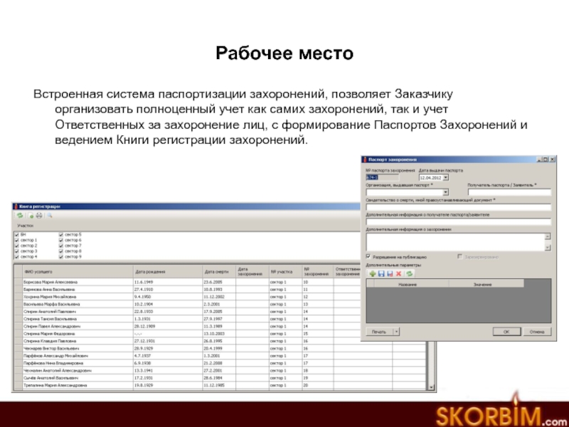 захоронений, так и учет Ответственных за захоронение лиц, с формирование Паспортов Захоронений и ведением Книги регистрации захоронений.