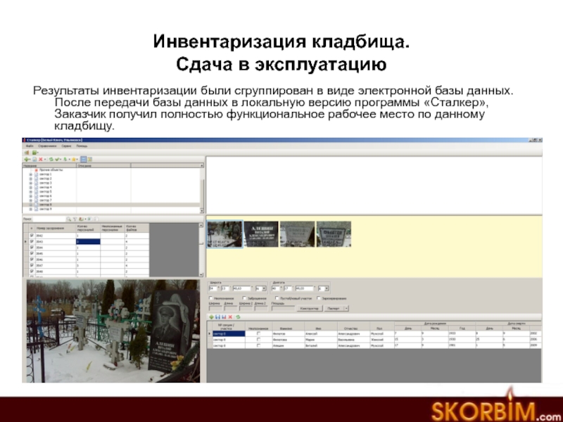 данных. После передачи базы данных в локальную версию программы «Сталкер», Заказчик получил полностью функциональное рабочее место по данному кладбищу.
