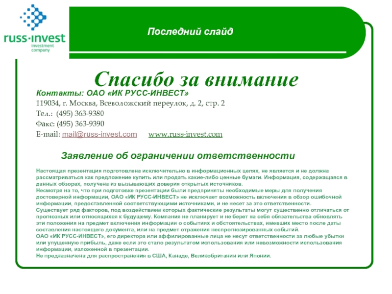 ОАО «ИК РУСС-ИНВЕСТ», его директора или аффилированные лица не несут ответственности за любые убытки или упущенную прибыль, даже если это стало результатом использования или невозможности использования информации, изложенной в презентации.