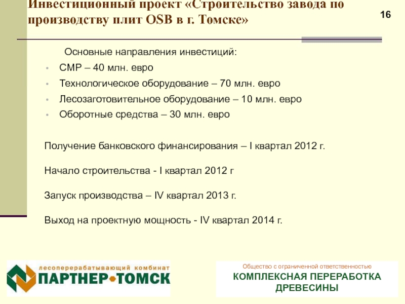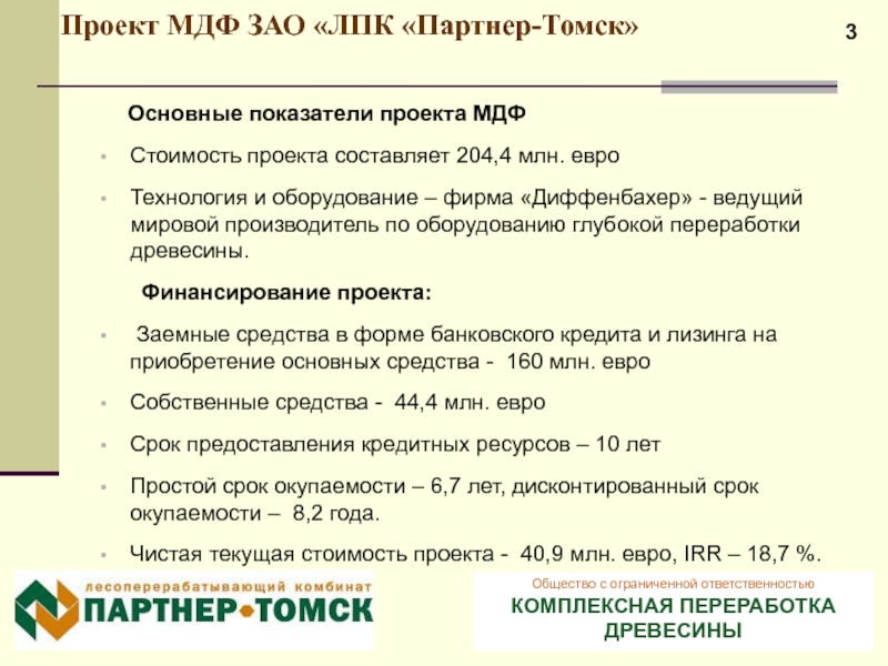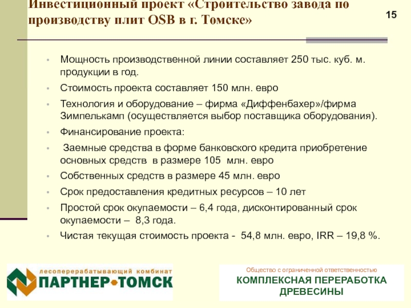 Чистая текущая стоимость проекта - 54,8 млн. евро, IRR – 19,8 %.